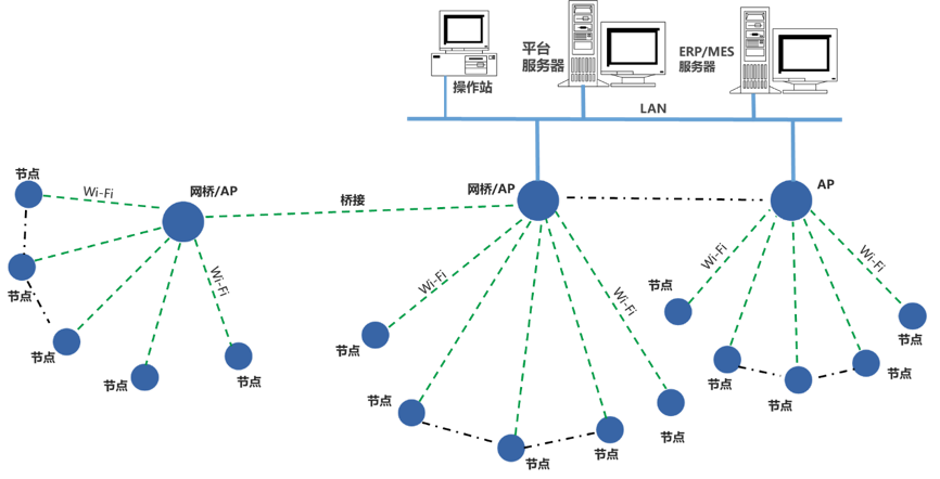 可用橋接的方式,延長(zhǎng)Wi-Fi通信距離。構(gòu)建專用的Wi-Fi網(wǎng)絡(luò),用于傳輸生產(chǎn)運(yùn)行數(shù)據(jù)。