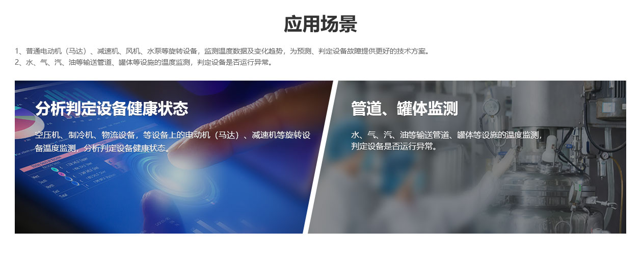 2、水、氣、汽、油等輸送管道、罐體等設(shè)施的溫度監(jiān)測(cè),判定設(shè)備是否運(yùn)行異常。
