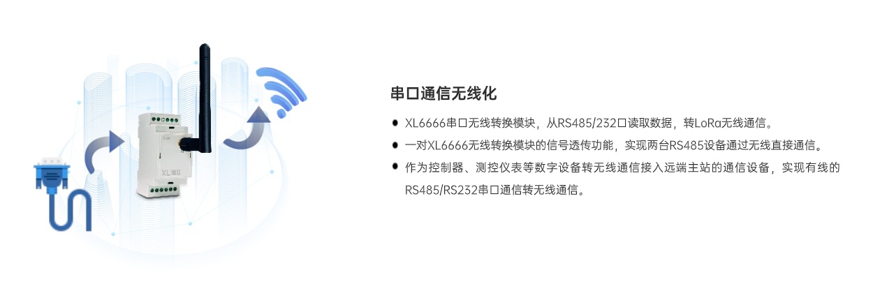 XL6666串口無線轉(zhuǎn)換模塊,作為控制器、測控儀表、智能設(shè)備等接入無線傳感網(wǎng)絡(luò)的節(jié)點裝置,將RS485串口通信轉(zhuǎn)換成LoRa無線通信,實現(xiàn)RS485通信口和LoRa無線通信相互轉(zhuǎn)換。有效解決設(shè)備間連接與數(shù)據(jù)傳輸?shù)葐栴},使傳統(tǒng)串口設(shè)備輕松融入物聯(lián)世界。