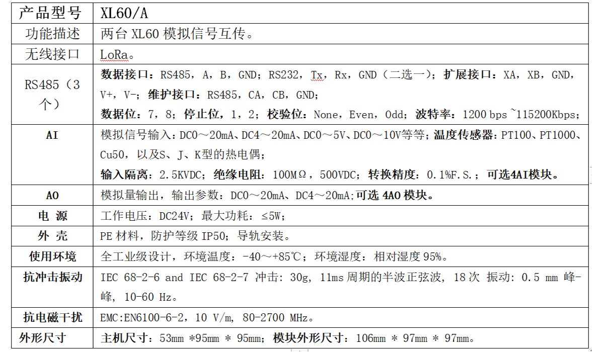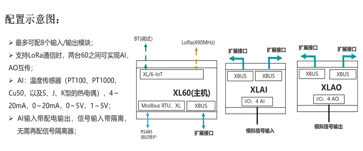 XL60A采用LoRa無(wú)線通信方式,每臺(tái)XL60A主機(jī)模塊,最多配兩個(gè)模擬量I/O模塊。