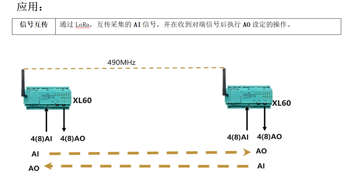 無(wú)線模擬量對(duì)傳模塊XL60A,由一對(duì)XL60A采集模塊組成,在一端的模塊輸入模擬信號(hào),無(wú)線對(duì)傳到另一端輸出模擬信號(hào),實(shí)現(xiàn)模擬信號(hào)一對(duì)一的輸入、輸出,AO隨著AI的變化而變化。