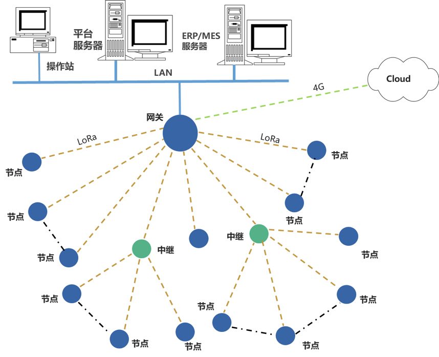 LoRa網(wǎng)絡(luò)是自定義通訊參數(shù)的LoRa通信網(wǎng)絡(luò);設(shè)計(jì)有中繼可延長(zhǎng)無(wú)線(xiàn)傳輸距離。物聯(lián)網(wǎng)關(guān)對(duì)節(jié)點(diǎn)的數(shù)據(jù)進(jìn)行通信協(xié)議轉(zhuǎn)換,可選多種通信接口、不同的通信協(xié)議,同時(shí)上傳數(shù)據(jù)至多個(gè)平臺(tái)服務(wù)器。