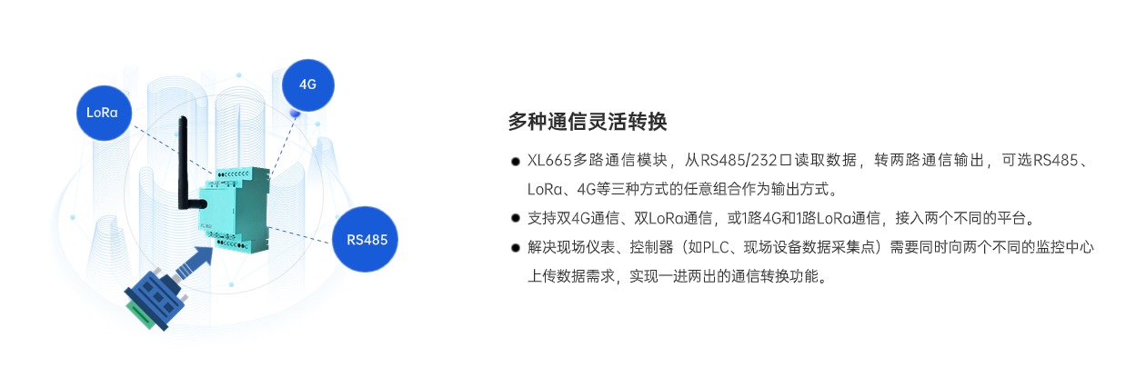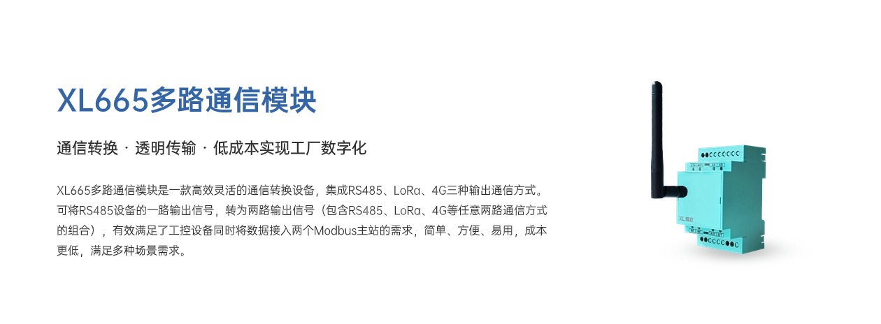 XL665多路通信模塊是一款高效靈活的通信轉(zhuǎn)換設(shè)備,集成RS4852、LoRa、4G三種輸出通信方式??蓪S485設(shè)備的一路輸出信號,轉(zhuǎn)為兩路輸出信號,(包含RS485、LoRa、4G等任意兩路通信方式的組合),有效滿足了工控設(shè)備同時將數(shù)據(jù)接入兩個Modbus主站的需求,簡單、方便、易用,成本更低,滿足多種場景需求。