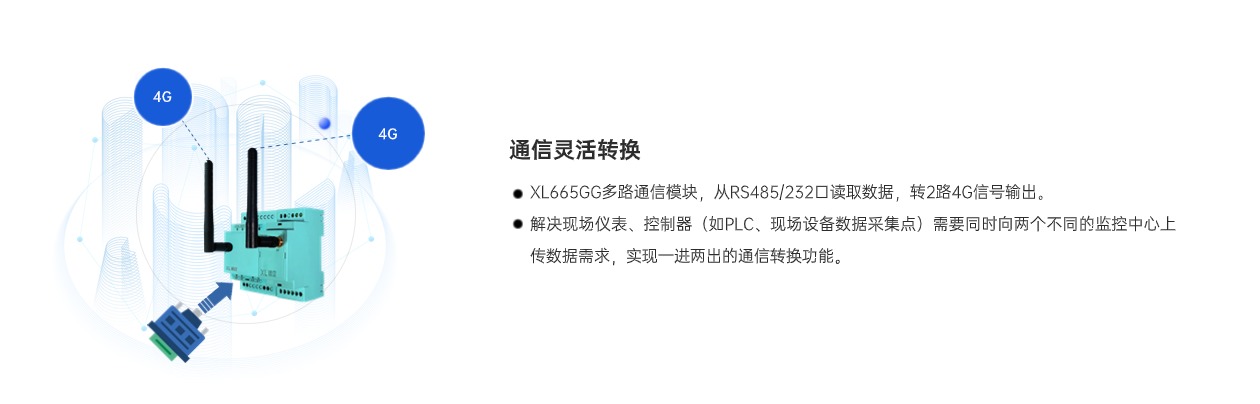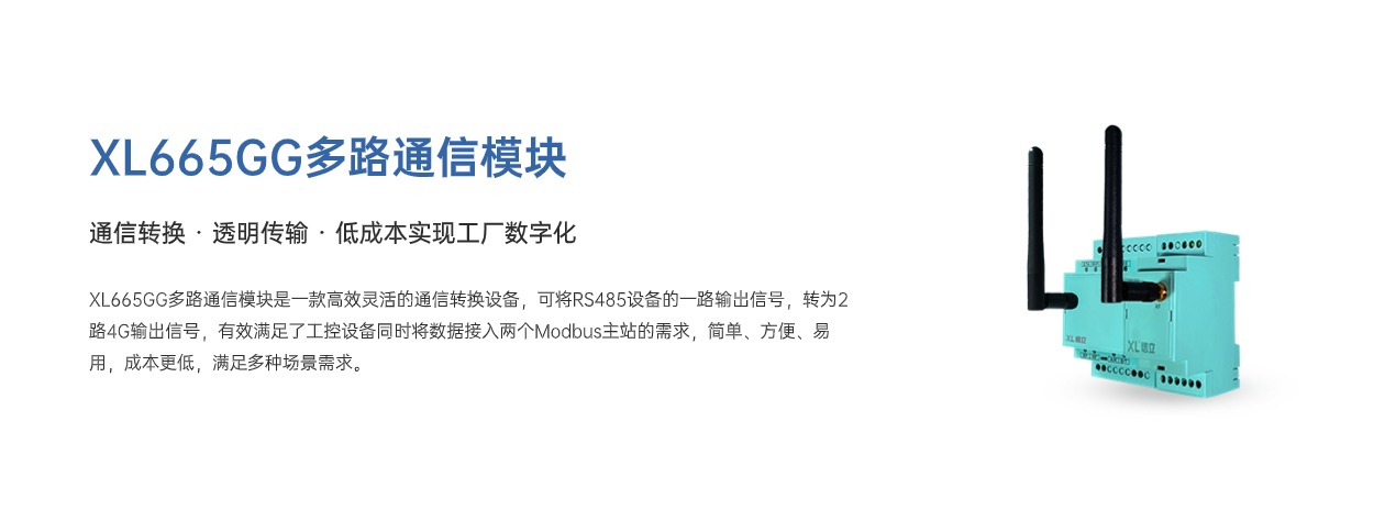 XL665GG多路通信模塊是一款高效靈活的通信轉(zhuǎn)換設(shè)備,可將RS485設(shè)備的一路輸出信號(hào),轉(zhuǎn)為2路4G輸出信號(hào),有效滿足了工控設(shè)備同時(shí)將數(shù)據(jù)接入兩個(gè)Modbus主站的需求,簡單、方便、易用,成本更低,滿足多種場景需求。