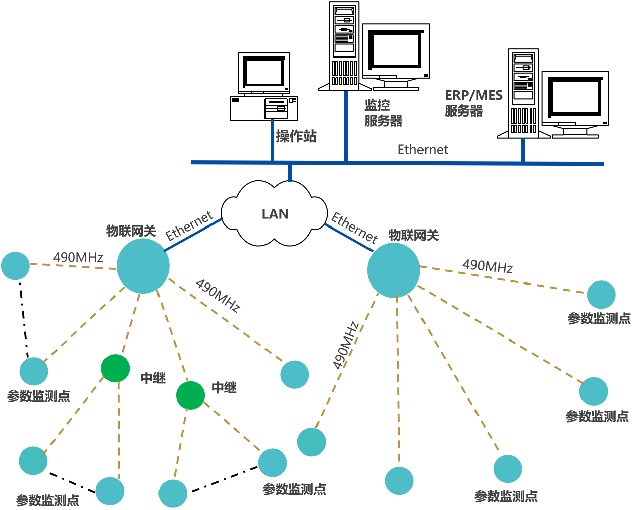 系統(tǒng)網(wǎng)絡(luò)方案一,用于工廠,或規(guī)模較小的園區(qū),水、汽、氣管網(wǎng)監(jiān)測系統(tǒng)。由監(jiān)測節(jié)點(diǎn)、網(wǎng)關(guān)和平臺(tái)軟件構(gòu)成