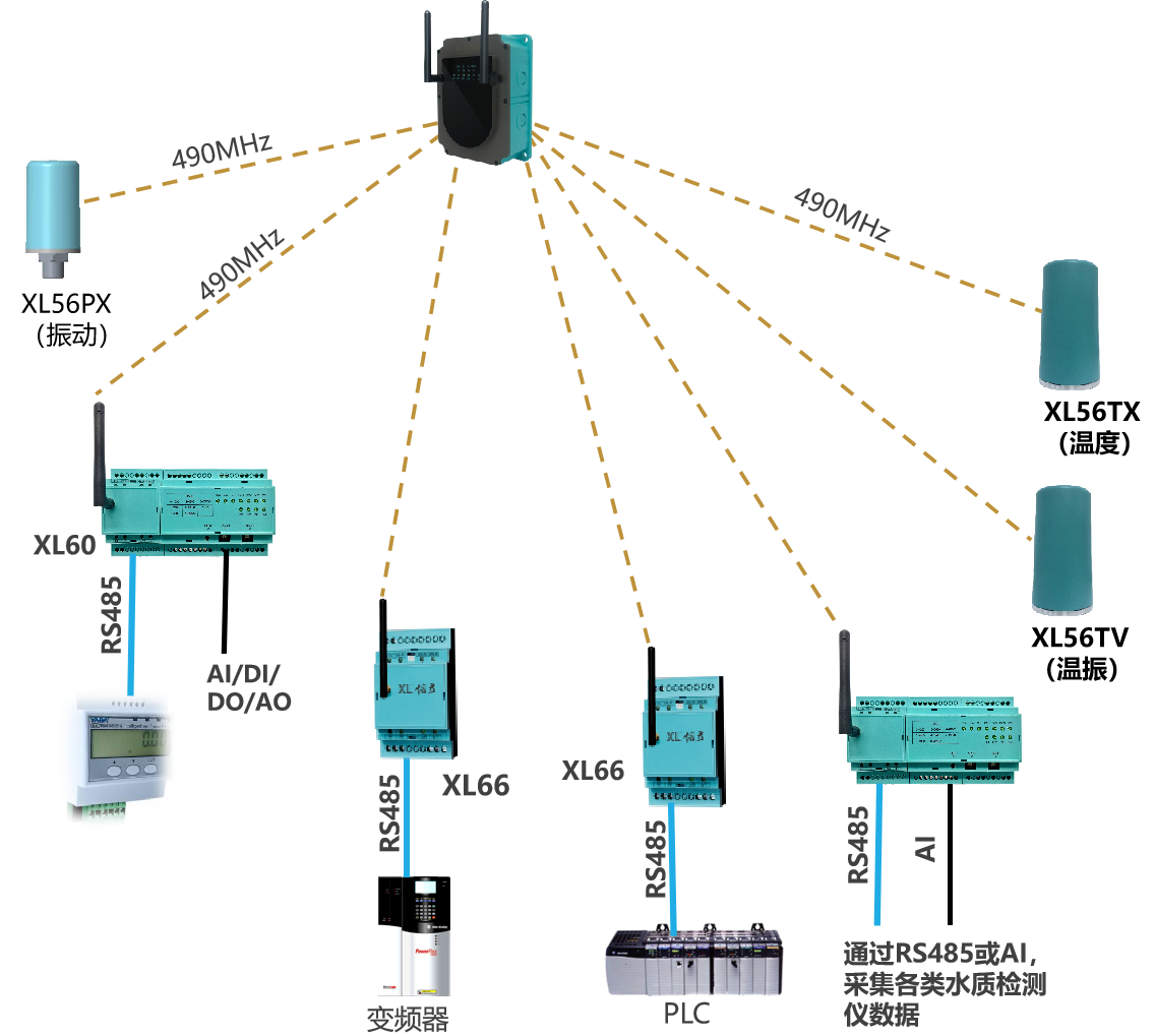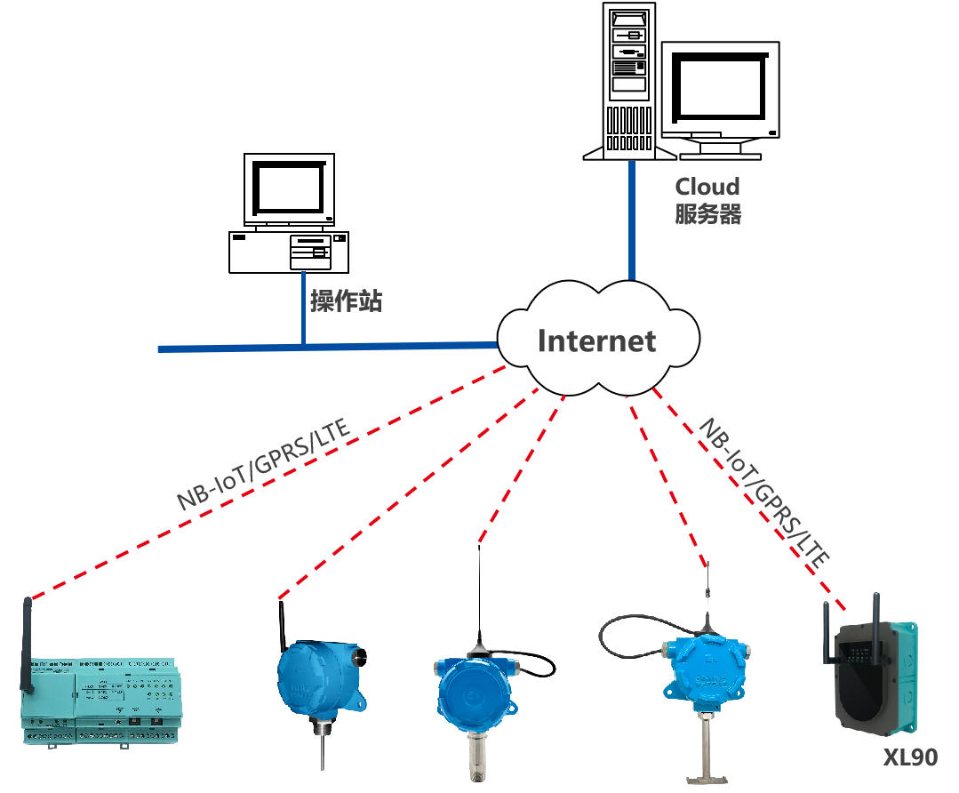 類似泵房、水廠、水源井等場所的數(shù)據(jù)監(jiān)測,監(jiān)測點(diǎn)的數(shù)據(jù)先上傳至XL90物聯(lián)網(wǎng)關(guān),再通過NB/GPRS/LTE轉(zhuǎn)發(fā)數(shù)據(jù)至云平臺(tái),此種情況,數(shù)以后在量大時(shí),可選LTE(4g)方式