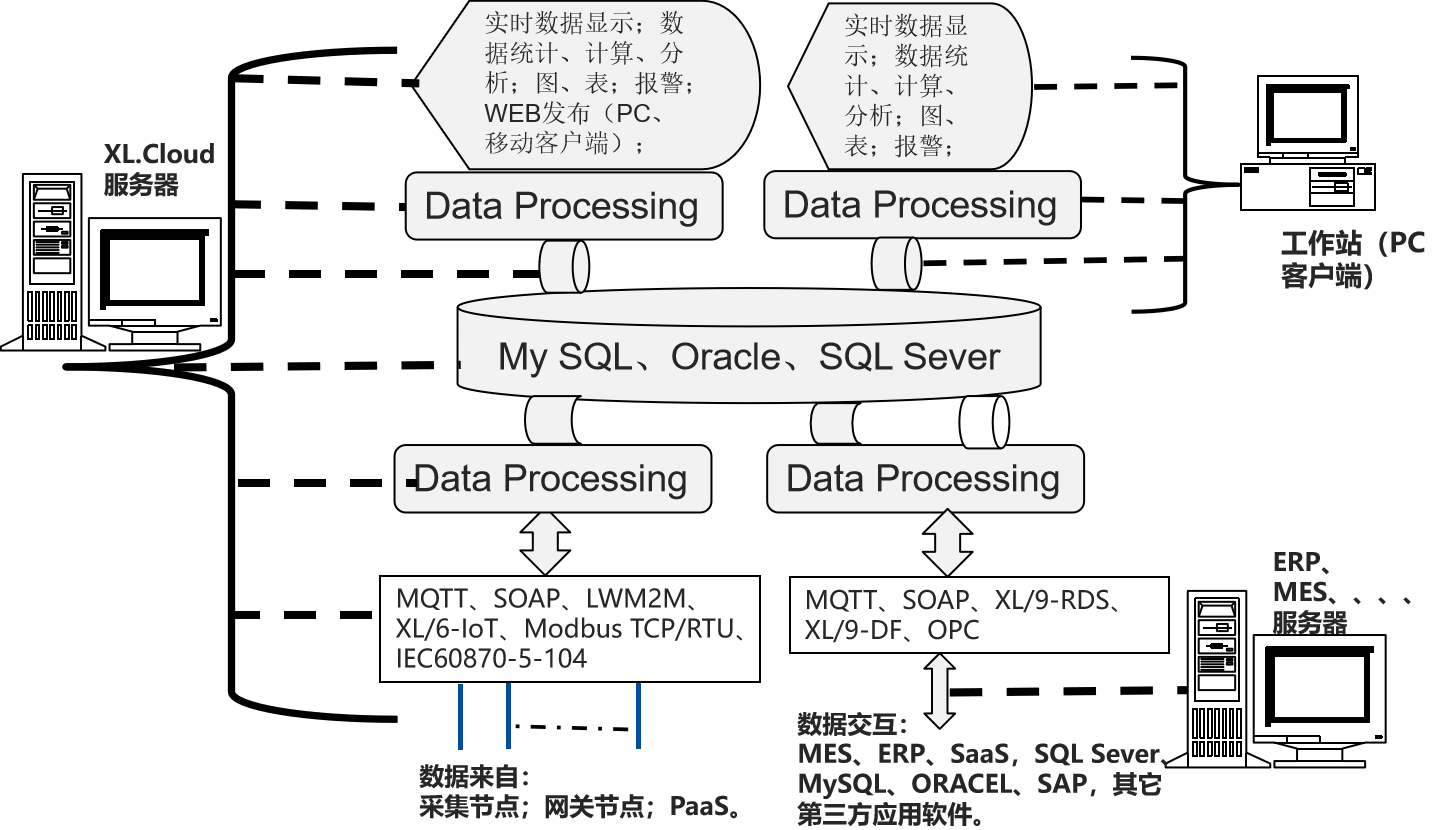 支持MQTT、LWM2M、SOAP,XL/6-IoT、XL/9-DB、XL/9-RDS,等等通信協(xié)議,并可和第三方數(shù)據(jù)庫,Oracle、SAP等交換數(shù)據(jù)