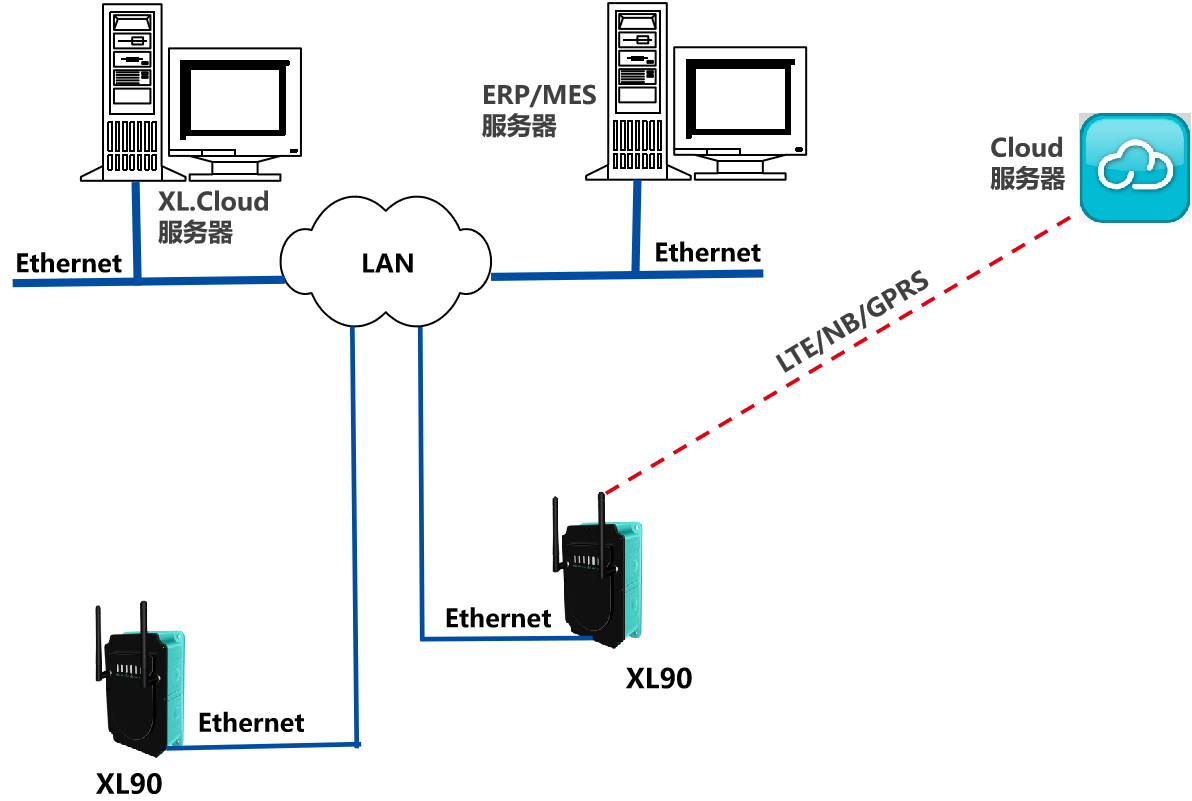 如下圖所示,XL90,將數(shù)據(jù)上傳給企業(yè)內(nèi)部的多個(gè)系統(tǒng)軟件平臺(tái);通過(guò)LTE(4g)/NB/GPRS將數(shù)據(jù)上傳至云服務(wù)器;
