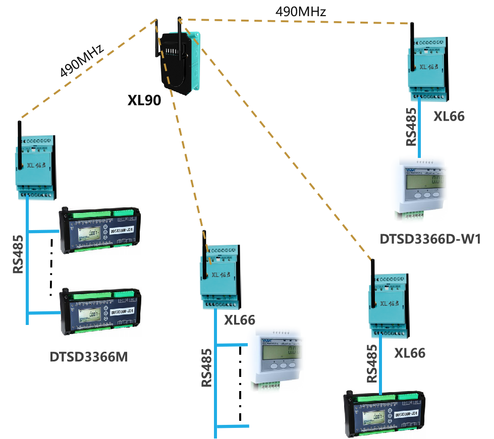每個(gè)監(jiān)測(cè)點(diǎn),配置1臺(tái)XL66智能轉(zhuǎn)換器,從RS485/232接口,讀取電能表的數(shù)據(jù),無(wú)線方式上傳至XL90物聯(lián)網(wǎng)關(guān);
