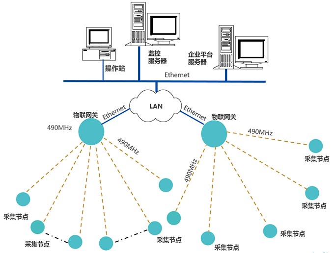 采集節(jié)點,通過490MHz無線上傳數(shù)據(jù)至物聯(lián)網(wǎng)關(guān),網(wǎng)關(guān)通過Ethernet,接入LAN,推送數(shù)據(jù)至企業(yè)管理平臺服務(wù)器
