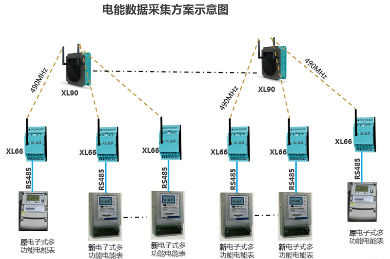 其它用電監(jiān)測點,每個監(jiān)測點配置1塊DTSD3366G電子式多功能電能表和1臺XL66智能轉(zhuǎn)換器,獲取監(jiān)測點的用電數(shù)據(jù),上傳至XL90物聯(lián)網(wǎng)關(guān)