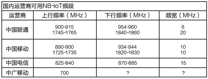 NB-IoT使用了授權(quán)頻段,有三種部署方式:獨立部署、保護帶部署、帶內(nèi)部署。全球主流的頻段是800MHz和900MHz。中國電信會把NB-IoT部署在800MHz頻段上,而中國聯(lián)通會選擇900MHz來部署NB-IoT,中國移動則可能會重耕現(xiàn)有900MHz頻段。具體如表所示: