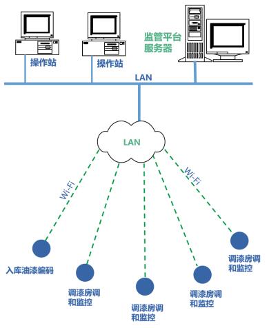 設計油漆調和監(jiān)管系統(tǒng),由監(jiān)管平臺服務器、油漆調和操作監(jiān)控終端、電子枰、油漆編碼終端、操作站等構成,通過工廠內的局域網(WI-FI)進行通信連接。