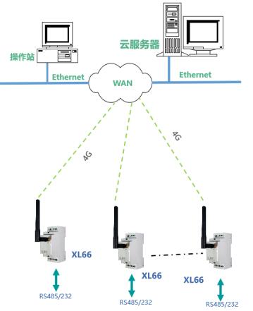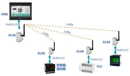 一臺(tái)XL66與多臺(tái)XL66連接,實(shí)現(xiàn)一對(duì)多,RS485/232設(shè)備間無(wú)線(xiàn)通信。