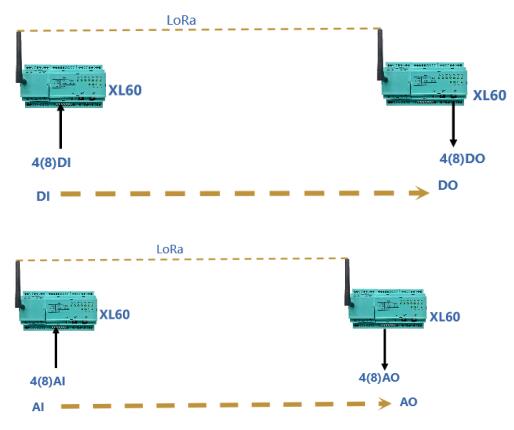 選擇一對(duì)基于LORA無線傳輸模塊的XL60主機(jī),其中一臺(tái)配置在現(xiàn)場(chǎng)采集端,通過RS485采集現(xiàn)場(chǎng)儀表的電流、電壓、開關(guān)等信號(hào),另一臺(tái)配置在控制儀表端,通過RS485與PLC、控制機(jī)臺(tái)、顯示儀表等連接,現(xiàn)場(chǎng)采集端的XL60可將采集到的數(shù)據(jù)通過LORA無線對(duì)傳到控制儀表端的XL60并上傳至控制儀表。