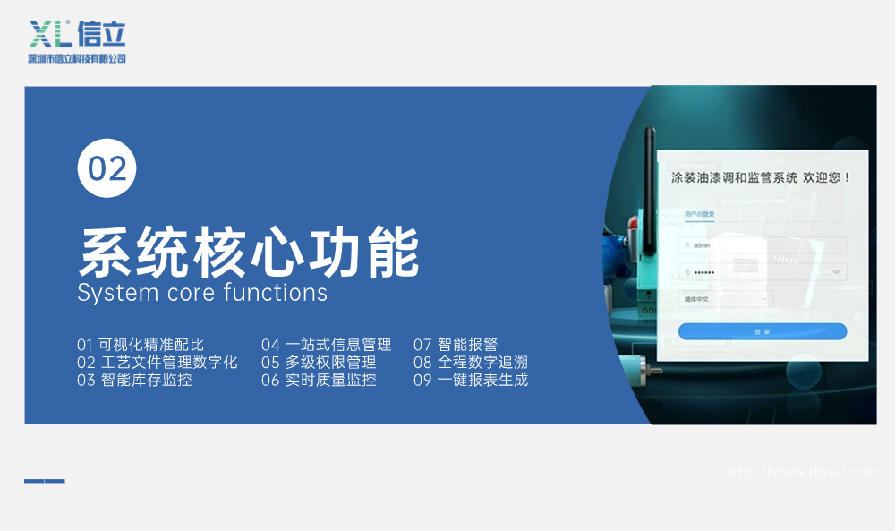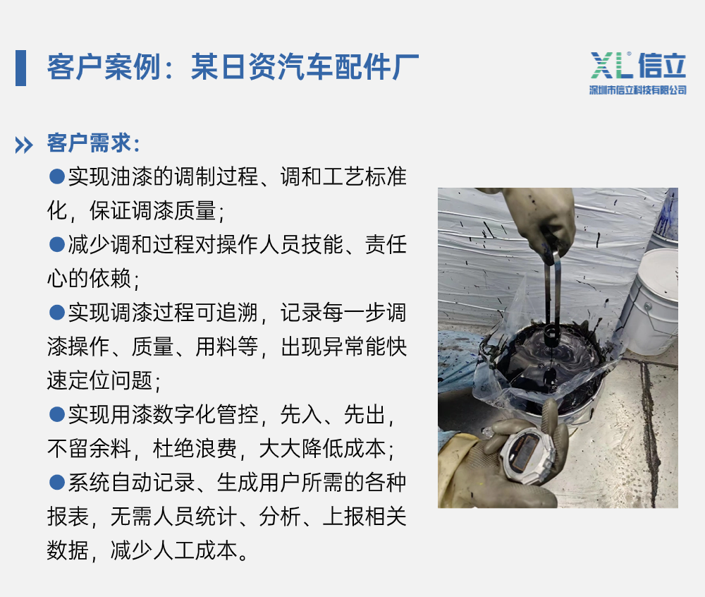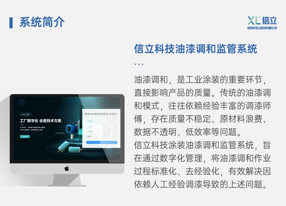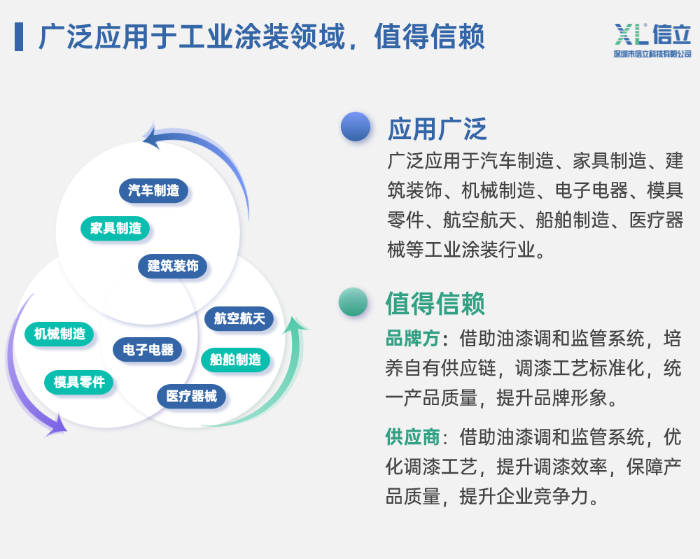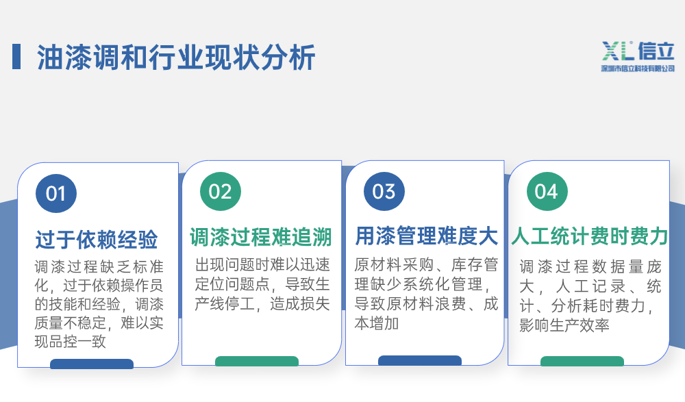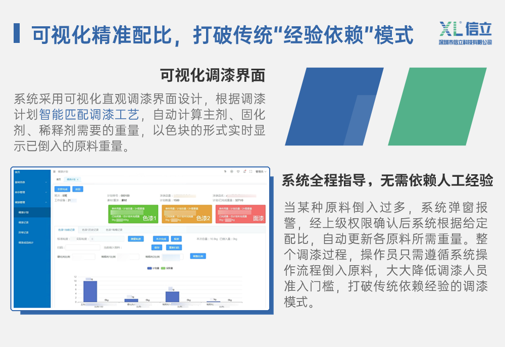 信立科技涂裝油漆調(diào)和監(jiān)管系統(tǒng),旨在通過數(shù)字化管理,將油漆調(diào)和作業(yè)過程標(biāo)準(zhǔn)化、去經(jīng)驗化,有效解決因依賴人工經(jīng)驗調(diào)漆導(dǎo)致的上述問題。