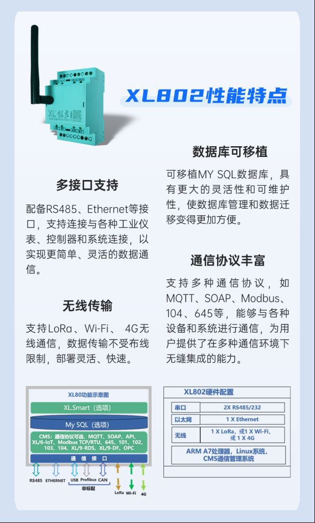 設(shè)備兼容性提升:XL802支持多種通信接口,具有強(qiáng)大的協(xié)議轉(zhuǎn)換功能,可以解決不同設(shè)備和MES之間通信協(xié)議不兼容的問題,使得各種接口類型的設(shè)備都能夠接入該系統(tǒng),大大提升了設(shè)備的兼容性;