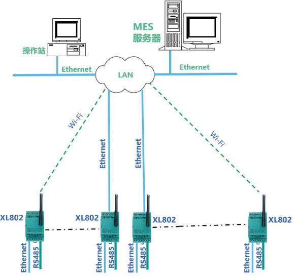 ? XL802 通信主機(jī)通過 Ethernet 或 Wi-Fi ,接入 LAN ,連接 MES 服務(wù)器。