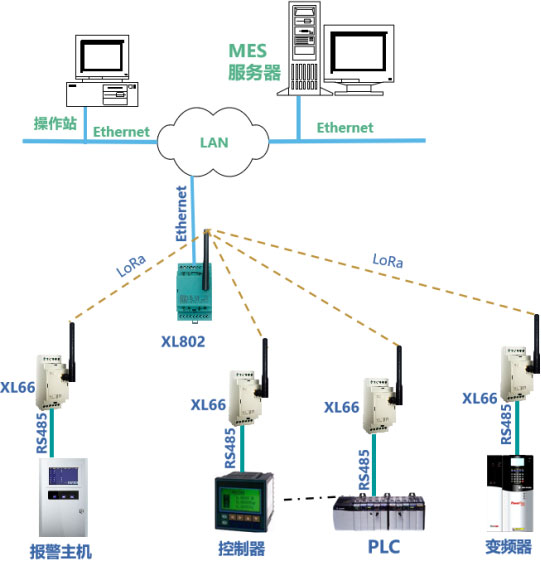 XL66無線轉(zhuǎn)換器通過RS485/RS232接口讀取設(shè)備數(shù)據(jù),設(shè)計XL802通信主機(jī)安裝在LAN口附近接入局域網(wǎng),并通過LoRa無線接口,從XL66無線讀取設(shè)備的運行數(shù)據(jù),通信協(xié)議轉(zhuǎn)換處理后,通過Ethernet,轉(zhuǎn)發(fā)數(shù)據(jù)至MES。