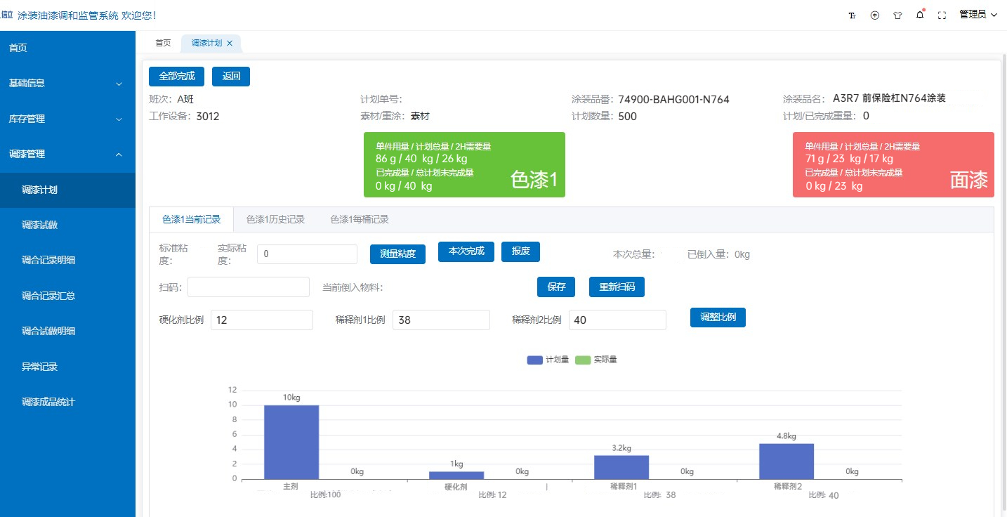 系統(tǒng)采用可視化直觀調(diào)漆界面設(shè)計,根據(jù)調(diào)漆計劃智能匹配調(diào)漆工藝,自動計算主劑、固化劑、稀釋劑需要的重量,以色塊的形式實時顯示已倒入的原料重量。