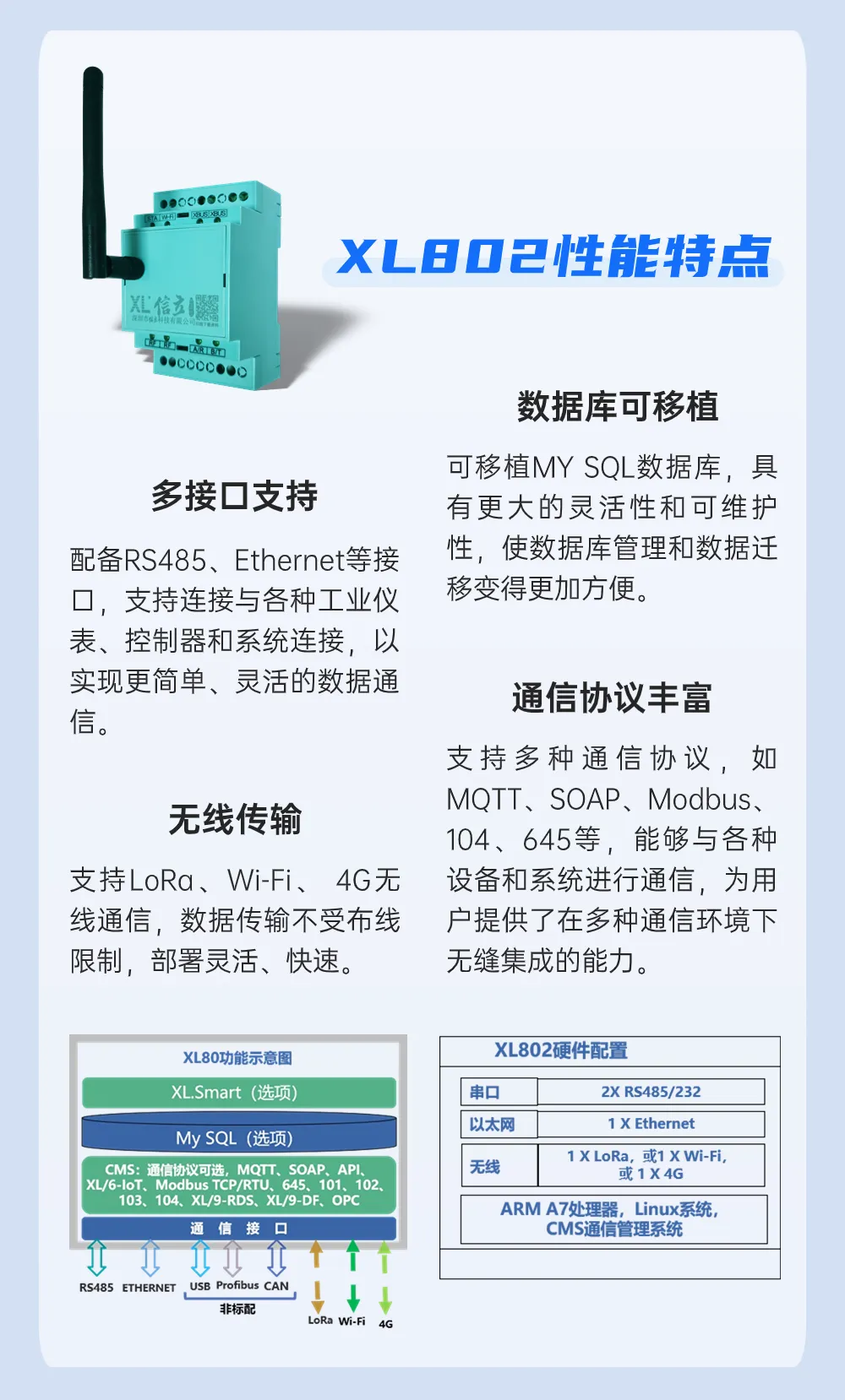 XL802通信主機(jī)對(duì)采集的數(shù)據(jù)進(jìn)行處理、協(xié)議轉(zhuǎn)換,通過(guò)Ethernet、Wi-Fi4G通信方式,將數(shù)據(jù)傳輸至監(jiān)控平臺(tái)。