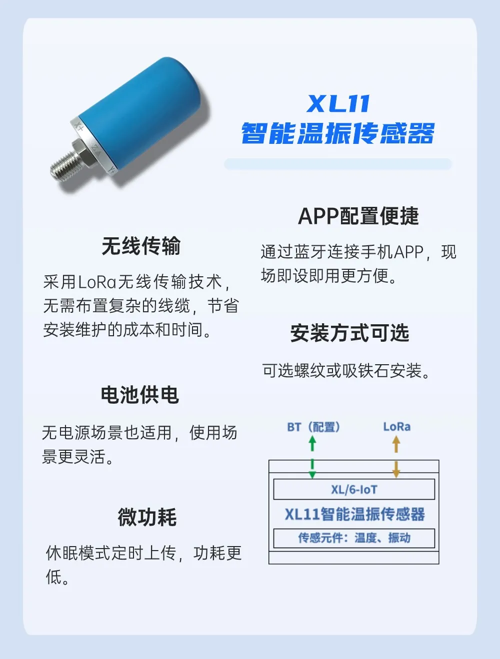 選擇XL11智能溫振傳感器,安裝在高爐、轉(zhuǎn)爐、連鑄機(jī)、熔煉爐等設(shè)備的電機(jī)和減速機(jī)上,實時采集溫度和X、Y、Z三個方向的振動數(shù)據(jù),為設(shè)備運行狀態(tài)的分析判斷提供數(shù)據(jù)支撐。