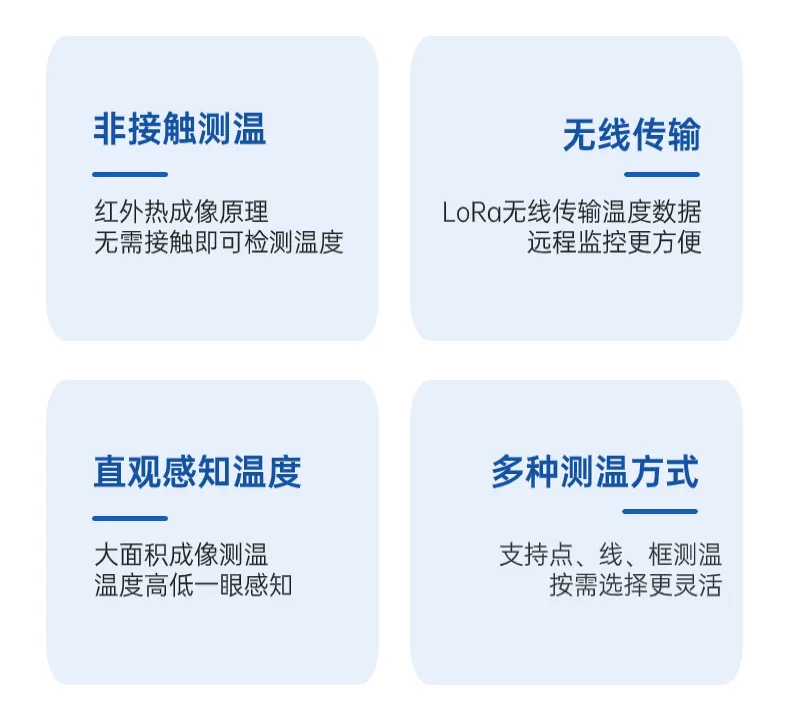 采用XL16IT無(wú)線紅外熱成像測(cè)溫傳感器,實(shí)現(xiàn)對(duì)配電柜、變壓器等電氣設(shè)備母線、銅排、電纜連接部位的非接觸式溫度監(jiān)測(cè)。配置氧化釩非制冷型探測(cè)元件,可同時(shí)監(jiān)測(cè)10個(gè)點(diǎn)、10個(gè)框、1條線的溫度,測(cè)溫范圍廣、精度高。