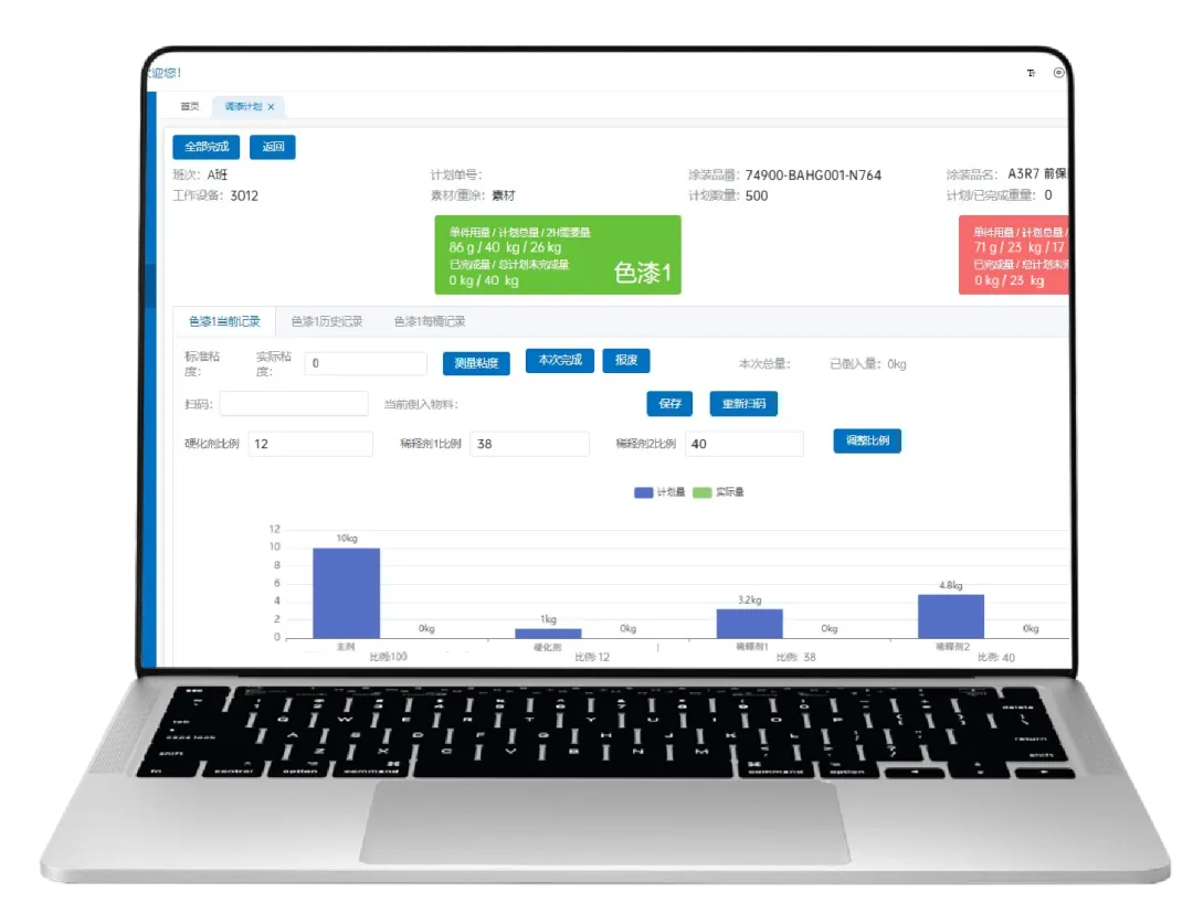 當(dāng)某種原料倒入過(guò)多,系統(tǒng)彈窗報(bào)警,經(jīng)上級(jí)權(quán)限確認(rèn)后系統(tǒng)根據(jù)給定配比,自動(dòng)更新各原料所需重量。整個(gè)調(diào)漆過(guò)程,操作員只需遵循系統(tǒng)操作流程倒入原料,大大降低調(diào)漆人員準(zhǔn)入門檻,打破傳統(tǒng)依賴經(jīng)驗(yàn)的調(diào)漆模式。