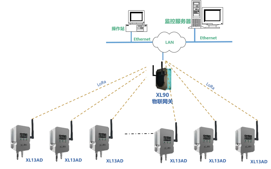 XL13AD無線壓差傳感器通過LoRa無線傳輸數據至XL906物聯網關,網關可選Ethernet、Wi-Fi、4G等多種方式將壓差數據傳輸至監(jiān)控平臺,實現遠程監(jiān)測。